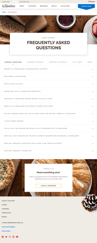 As a restaurant, la Madeleine naturally received many phone calls about ordering, the menu and rewards so when we were tasked to create an FAQ section we knew we had to organize it in the most seamless way. This lead to a mobile responsive, categorized list of questions.