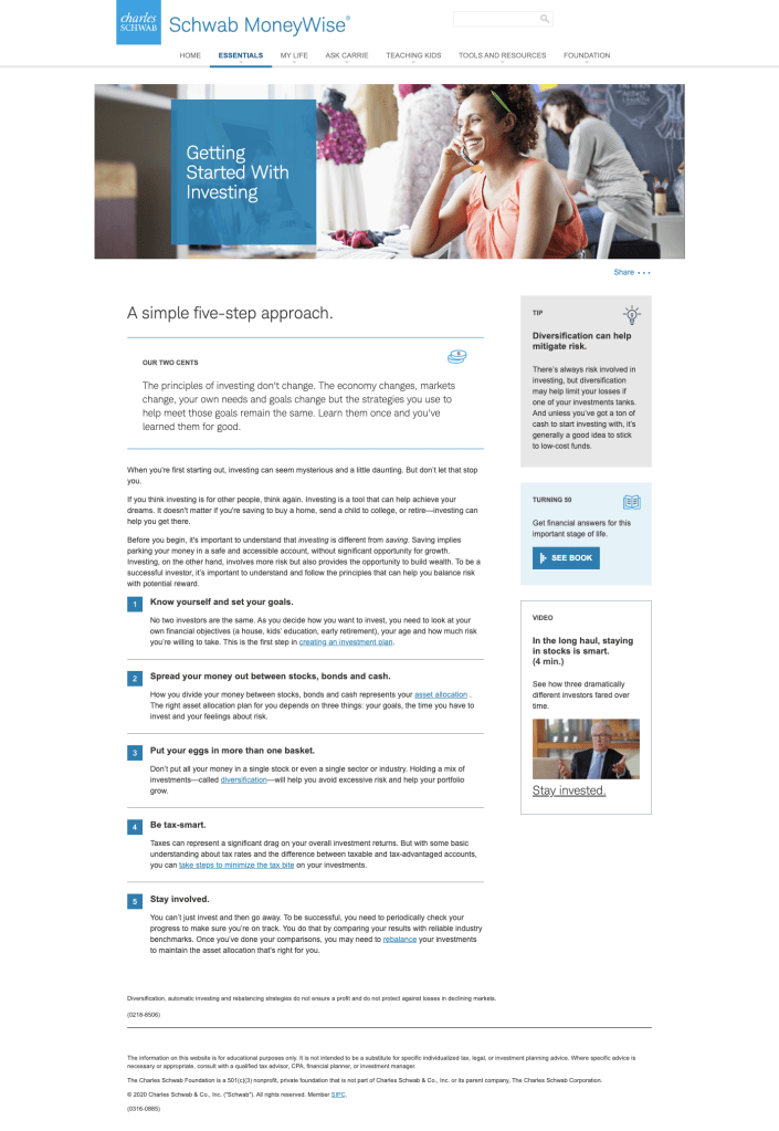 When someone visits Schwab MoneyWise they’re looking for is financial support and guidance. Since we already had a library of valuable and rich video, we decided to supplement article pages with left rail video content. The article, in turn, was able to help both readers as well as watchers of content.